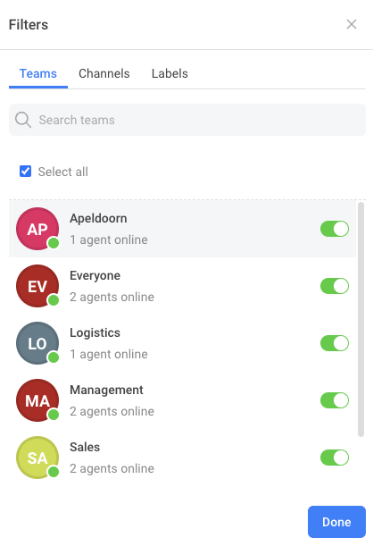Use team filtering to quickly get an overview of conversations assigned to a specific team, or choose "Select all" to select all teams.