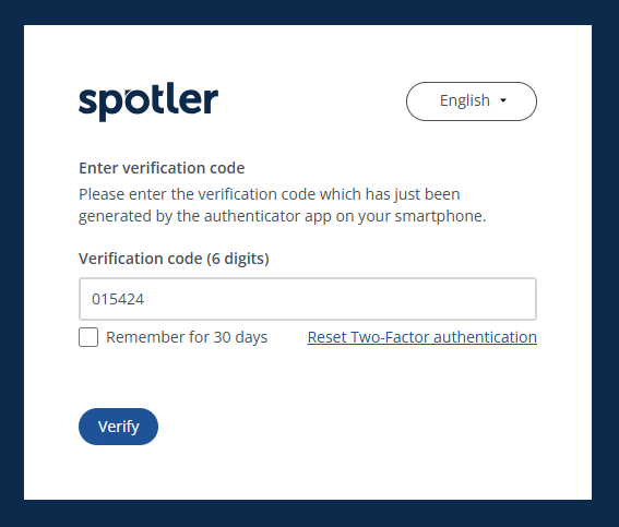 In the following step, you will be asked for your two-factor authentication (2FA) verification code. This is mandatory with using Spotler ID. If you already had two-factor authentication set up in Spotler Message, you will keep using the same existing item in your Authenticator app, that you had for Spotler Message.